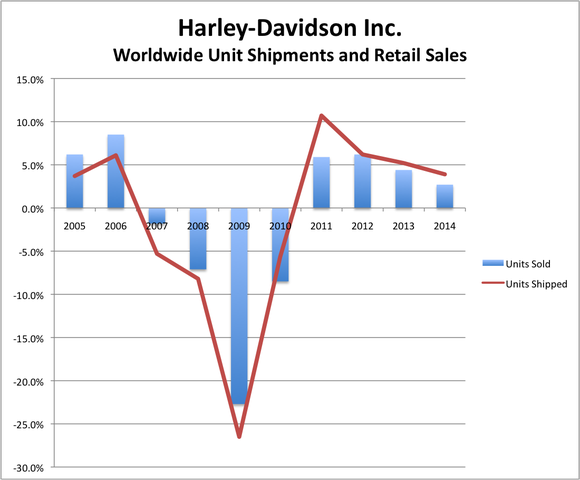 Yet Harley was also shipping more bikes out to its dealers than they were selling. I had said I wouldn't accuse management of channel stuffing at the time, but the imbalance in shipments compared to sales was curious and seemed to indicate it was important the motorcycle maker surpassed the hurdle it had set for itself because it had already lowered the bar.