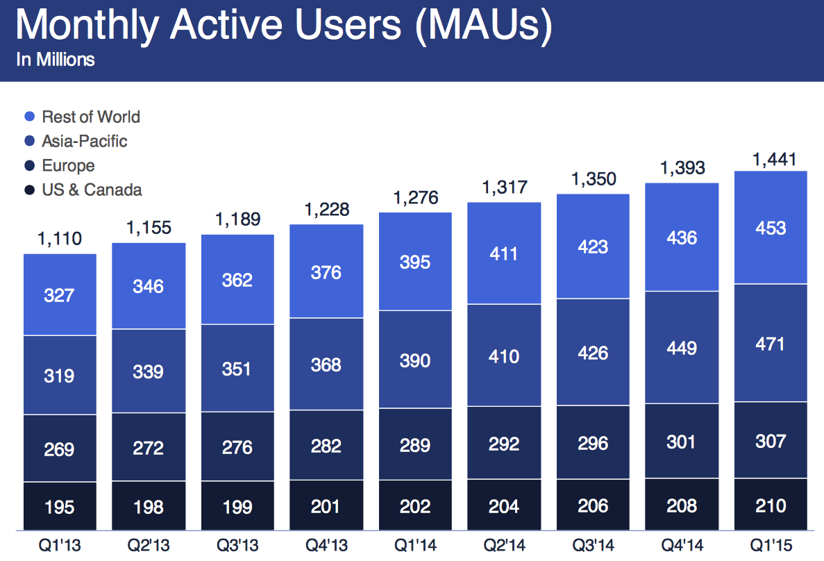 Fortunately, Facebook's user growth is looking incredibly solid. In Q1, the social network's monthly active users, or MAUs, hit 1.44 billion, up 3.4% from the quarter before. This growth is actually an acceleration from Facebook's 3.2% growth between the third and fourth quarter of 2014.