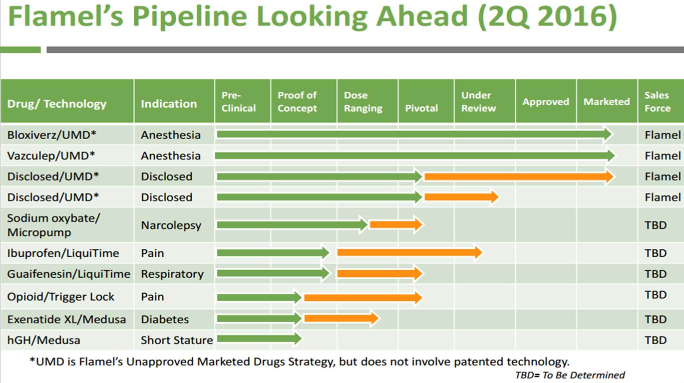 Flamel's story only truly gets exciting when peeking ahead into 2016, though. The company announced recently that it should have a third drug approved by the second quarter of next year, and two others under regulatory review: