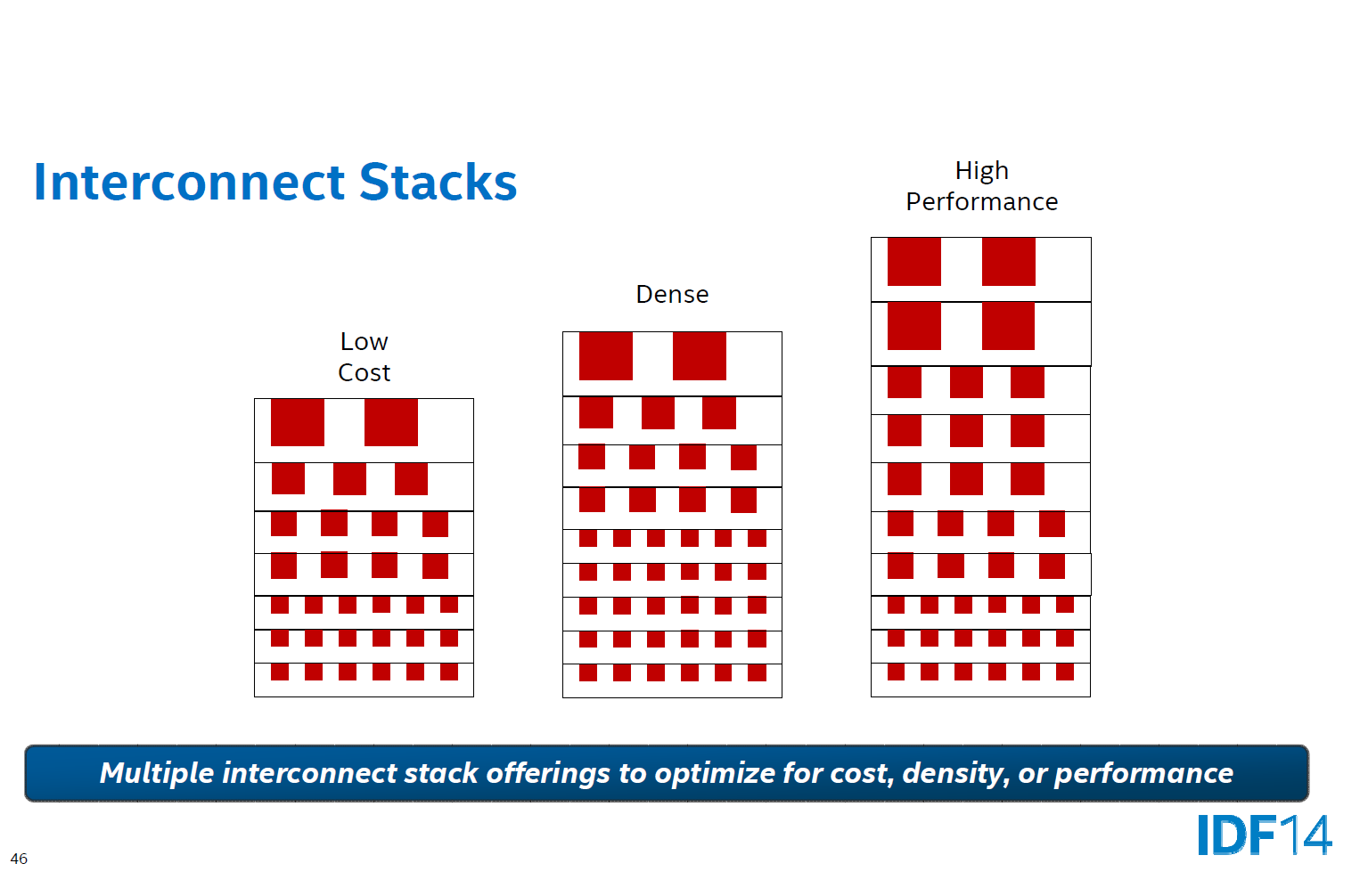 The purpose of this slide was to illustrate that chip designers could use different interconnect stacks -- which play a key role in determining the performance and density of a chip -- to optimize for different things such as cost, density, and/or performance.