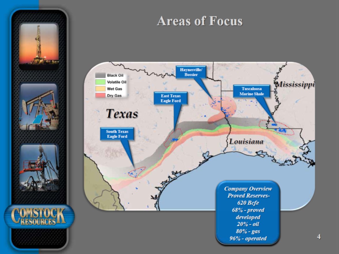3) Comstock Resources (CRK +0.00%), 31.6% of shares sold short: If oil and gas prices were in better shape than they are today, then perhaps the holdings at Comstock would look much more promising. Its current assets are producing assets in both the Haynesville-Bossier and Eagle Ford Shale, as well as prospective acreage in both the Eastern fringes of the Eagle Ford and the Tuscaloosa Marine Shale.