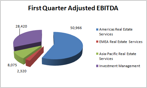 In other words, both of the company's segments are dependent on increases in commercial property rents and capital values (more on that subject later). For now, here is a chart of adjusted earnings before interest, taxes, depreciation, and amortization, or EBITDA, in the quarter. Clearly, the Americas are where the action is for Jones Lang LaSalle.