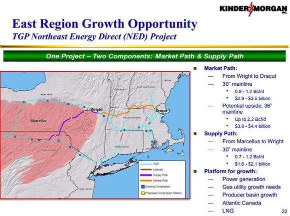 The North East Direct Project -- which represents about 33% of Kinder's shadow backlog -- would transport up to 3.4 billion cubic feet of natural gas per day from the Utica and Marcellus shale to major markets in the Northeast, such as New York and Boston.