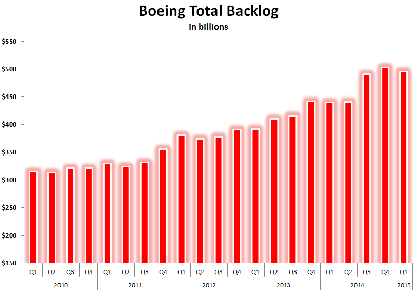 As you can see in the graph above, Boeing's backlog sits at an extremely high level of $495.1 billion -- and $435 billion of that total is from Boeing's healthy commercial airplane business. If you're wondering, that's roughly five times the amount of revenue Boeing anticipates it will generate this year.