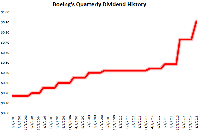Early in 2015 Boeing's dividend was increased 25% to $0.91 per share, and it has increased by over 192% total over the past decade.