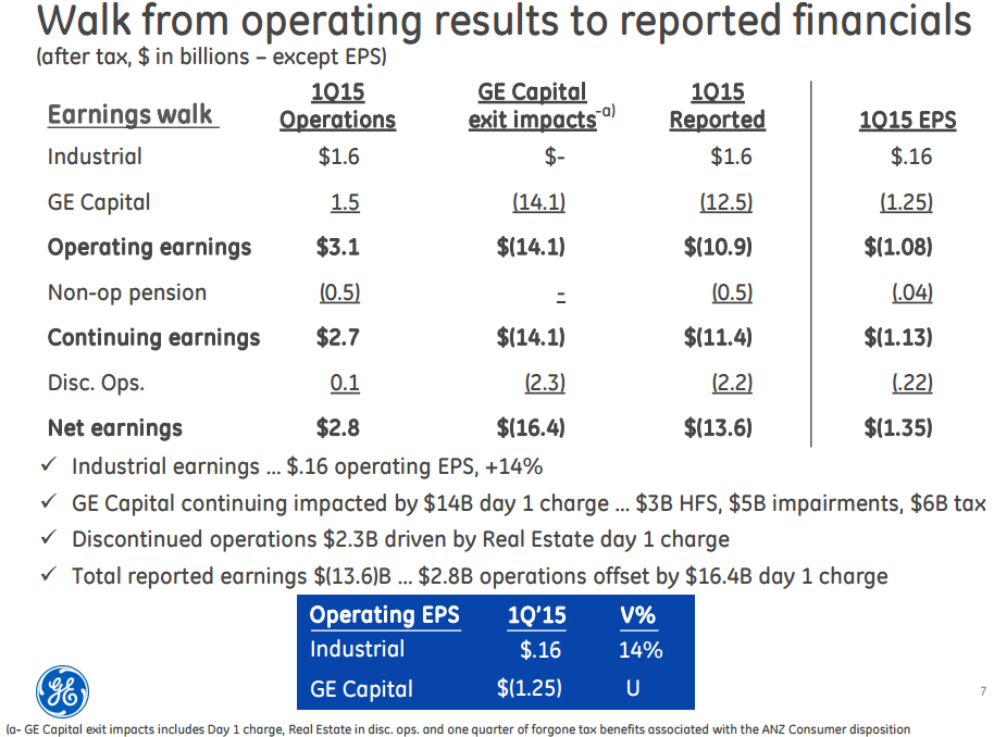 Now, with GE continuing to divest itself from the capital business segment, the company has reemerged as an industrial powerhouse and will continue to focus on its roots. In fact, GE's first-quarter was much better than many investors who merely glanced at the numbers realized. For instance, GE's industrial operating earnings-per-share increased 14%, and industrial segment profit was up 9%, while the overall decline was mostly due to charges associated with GE Capital. To see the significance, look below.