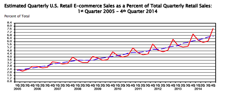 Let's start with e-commerce. Because e-commerce giants like Amazon and eBay have been around for the better part of the past two decades, it's easy for investors to mistakenly conclude that this is a "mature" category. That simply isn't the case, which you can plainly see thanks to quarterly data I often reference from the Department of Commerce.