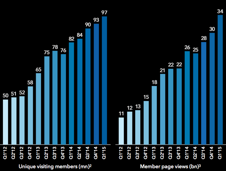 2. Engagement is still rising rapidly. The professional network is still making formidable gains in member engagement. To put its increasing engagement in perspective, consider that LinkedIn's member page views are growing considerably faster than unique visitors.
