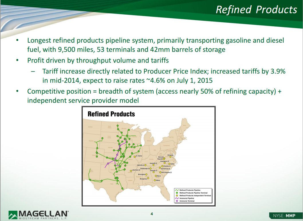Magellan Midstream Partners: One of the safer investments in any part of the oil and gas market is in the pipelines that transport those products from source to refinery to end market. These pipelines traditionally generate revenue on long-term fixed-fee contracts that have little connection to the actual price of oil itself. Not only does Magellan benefit greatly from this sort of revenue stability -- about 85% of Magellan's operating margin comes from fixed-fee contracts -- but a large part of that pipeline network is actually a regulated monopoly because much of its petroleum pipeline network is the only provider of petroleum products in certain regions of the country. Like utilities of old that had little to no competition, Magellan is pretty much guaranteed returns on large portions of its network.