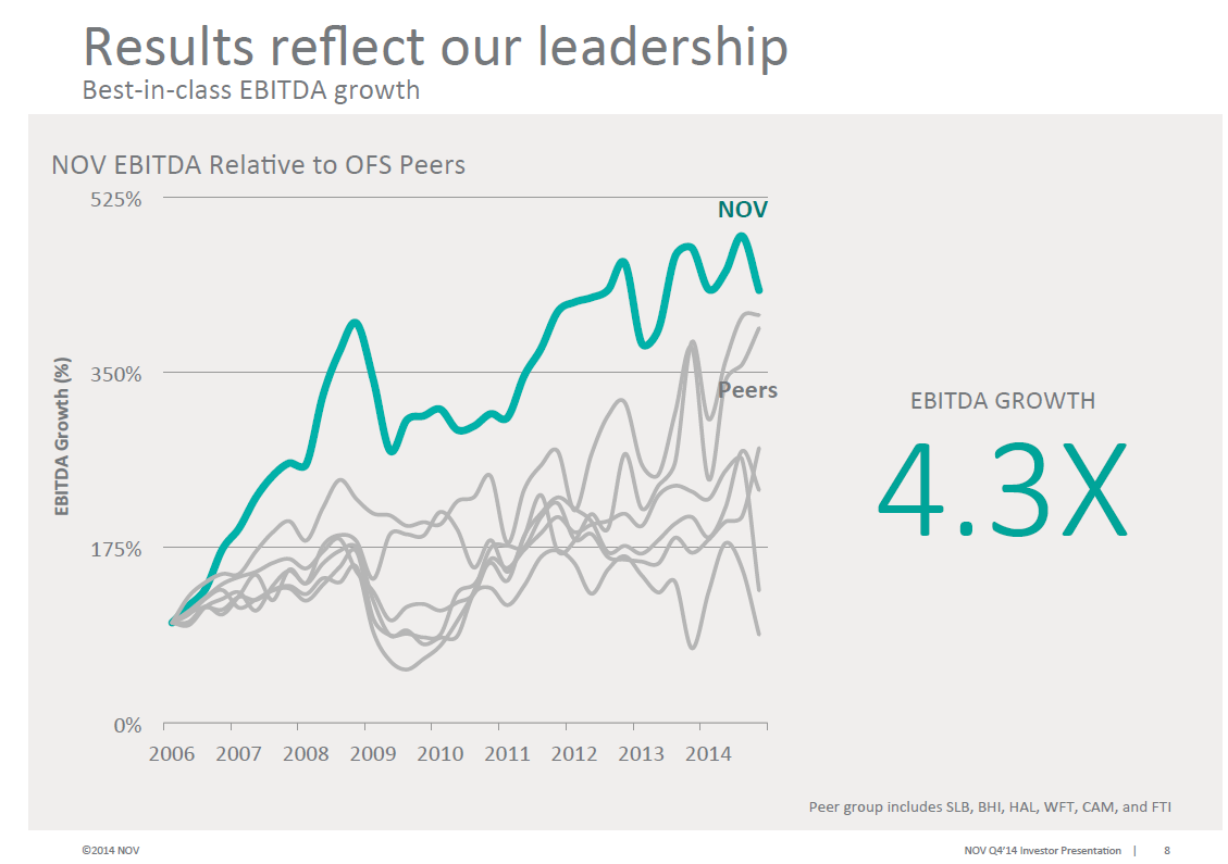 National Oilwell Varco: If you were to look at the stock price of National Oilwell Varco over the past several months, you might not think that this company should qualify as a safe oil investment. After all, shares have declined by 40% since their highs back in September and the oil market really started to take a turn for the worse. However, one thing that National Oilwell Varco has proven over the years is that it has handled down markets better than just about every other oil services company thanks to a large backlog of orders and a recurring revenue stream from selling replacement parts for its equipment that is out on the job. Over the past 9 years -- a period where we have seen two major downturn in the energy market -- National Oilwell Varco has more than quadrupled its EBITDA.