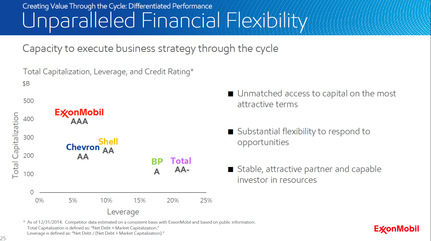 There is quite possibly no company that personifies this level of safety and stability like ExxonMobil. With a market capitalization of $366 billion, the company enjoys economies of scale that few companies can replicate. Also, its AAA credit rating gives it access to some of the cheapest debt out there, making it much easier for the company to finance new large scale projects. Not that it needs to, though, because for years ExxonMobil has generated more than enough cash from its operations to cover its capital expenditures as well as pay a hefty dividend and repurchase shares. The company will still go through some ups and downs as oil prices swing back and forth, but the company is built to handle it and provide shareholders with a long-term wealth-building machine.