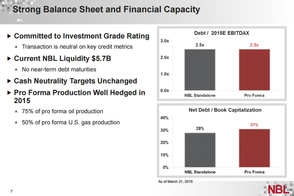 Noble Energy saw Rosetta's stumble as a chance to pounce. Armed with an investment grade credit rating, strong financial position, and robust liquidity Noble Energy was able to acquire the indebted Rosetta with minimal impact to its own balance sheet. This is clearly seen on the slide below as Noble's Debt-to-EBITDAX and Net Debt-to-Book Capitalization are barely changed with the acquisition.