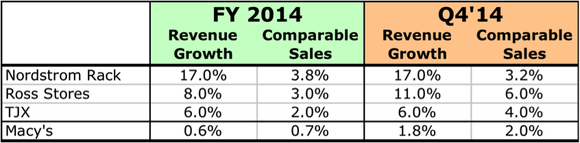 Without question the off-price retailers are enjoying a fair bit of success. Just look at how their performance stacked up against Macy's last year: