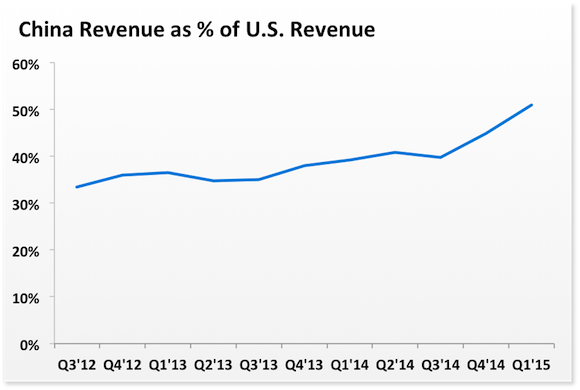 Framed another way, here's how quickly Apple's China revenue has been catching up with U.S. revenue in relative terms.