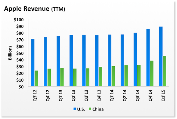 Over the past four quarters, Apple generated $45.5 billion in revenue in its Greater China operating segment. That's a hair over half of the $89.2 billion in revenue that it's brought in stateside.