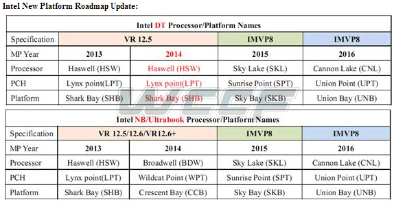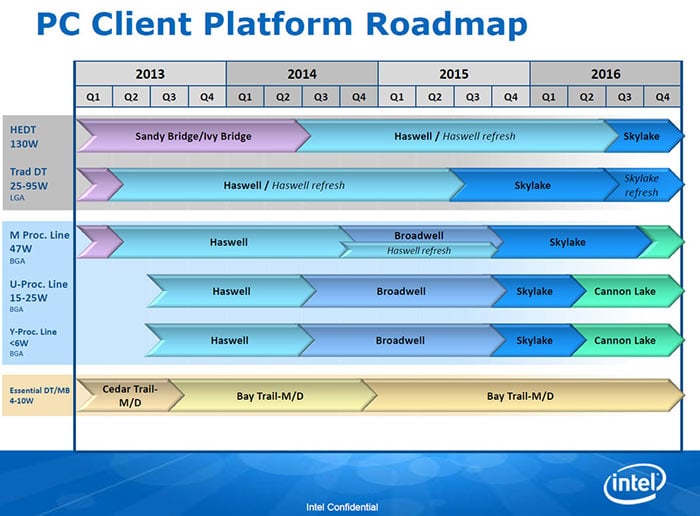 Additionally, note that this road map calls for Broadwell-U and Broadwell-Y parts to be released in late second-quarter/early third-quarter 2014. The initial Broadwell-Y (i.e. Core M) processors didn't roll out until the third quarter of 2014, and they did not show up in high volumes until early 2015.