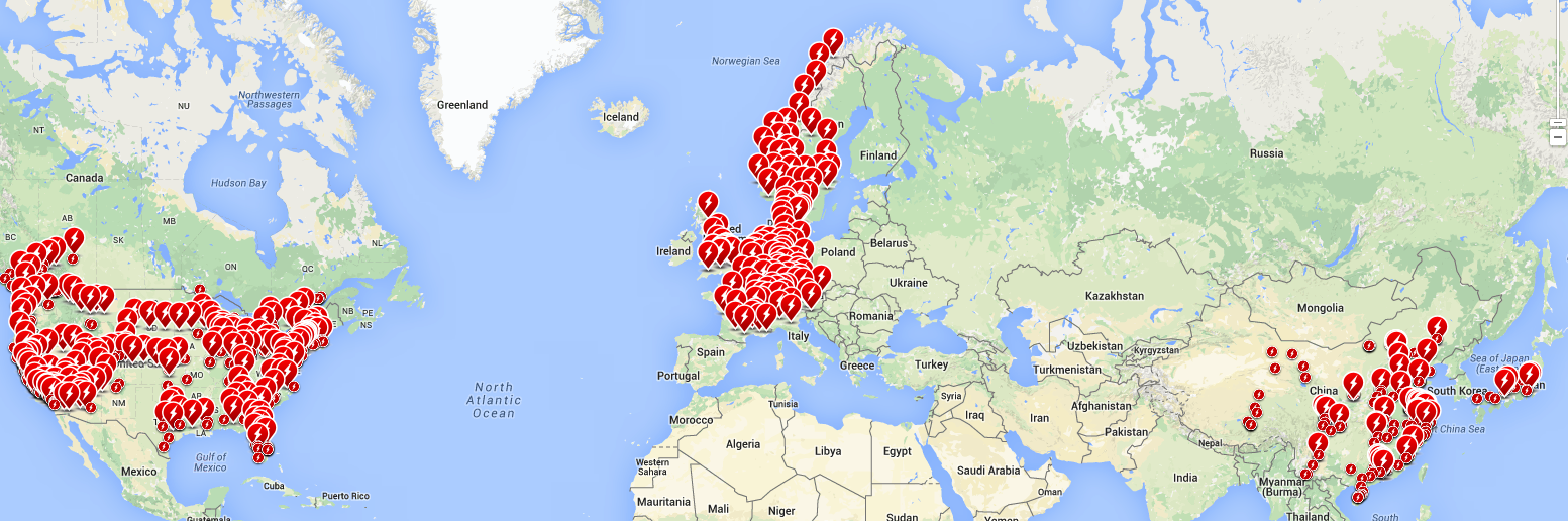 Tesla Charging network (excluding Australia). Larger red icons indicate Supercharger locations. Smaller icons indicate Destination Charger locations. Image source: Tesla Motors.