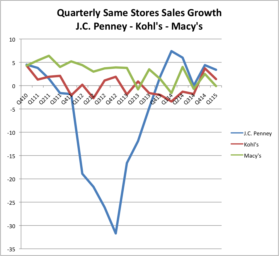 By at least one measure J.C. Penney is doing better than rivals. Data: Company quarterly SEC filings.