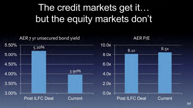 Based on forward earnings expectations, we can determine that stock investors require an earnings yield of 11.7% to own the stock, or roughly three times the return debt investors require. That ratio was closer to 2:1 immediately following AerCap's purchase of ILFC.