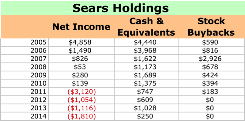 Back when Sears Holdings was still generating profits, Lampert was using the company's available cash to buy back its high-priced stock to juice per-share earnings. Between 2005 and 2010 (the last year the retailer reported a profit), Sears recorded net income of almost $3.8 billion, but spent over $5.8 billion on share repurchases, sometimes at prices as high as $170 a share. It was a careless decision at a time when many other businesses were curtailing their buyback programs to adjust to the recession and constrained consumer spending.