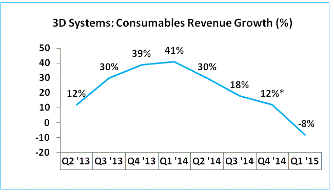 3D Systems' year-over-year quarterly consumables revenue growth has fallen off drastically since it peaked in Q1 2014. It's important to note, however, that more recent quarters have been adversely affected by the strengthening U.S. dollar.