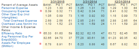 Notice that the bank's efficiency ratio for the first quarter of 2015 was just over 65%, which means PNC spent roughly 65% of its revenue on noninterest expenses. In the third column, titled "PCT," we see this ratio puts it in the 59th percentile of its peer group -- banks with more than $3 billion in assets.
