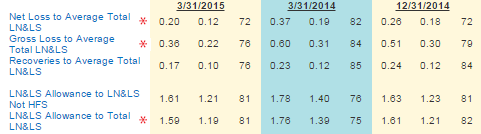 The first column shows that PNC Bank experienced annualized loan losses equal to 0.20% of its average total loans and leases in the first quarter of 2015, which is slightly higher than its peer group. Its gross losses, which exclude recoveries from soured loans in the past, came in at an annualized rate of 0.36% of its total loans and leases, again higher than its peer group.