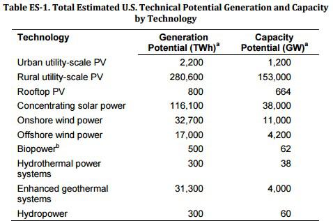 Not all energy is created equal, and natural gas fills a complementary role to renewable energy. In theory, wind and solar energy could easily provide all the power America ever needs. Our nation's current electricity generation capacity is around 1,200 GW. That's equivalent to 7.9% of wind power's potential and just 0.8% of solar's, according to the National Renewable Energy Laboratory.