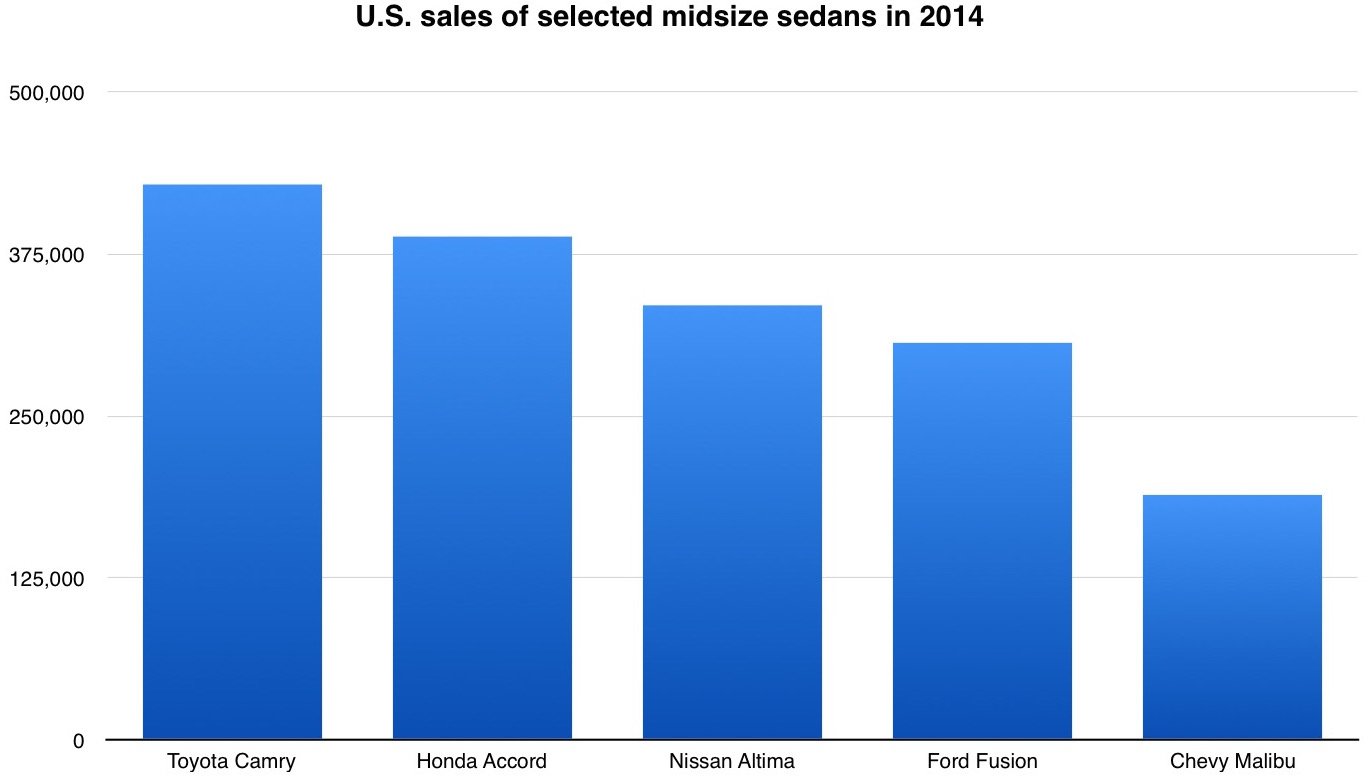 The Malibu's sales were far behind those of the "big four" sedans in 2014. GM hopes the new car will sell better, while generating more profits per sale. Source: Automotive News.