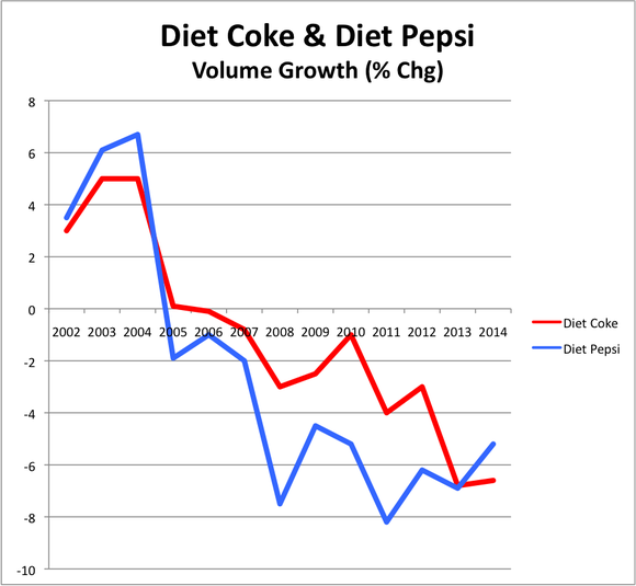 Soda consumption is falling on a global scale, but even more so here at home. Coca-Cola's (KO +0.13%) revenue rose 1.2% this past quarter not because it was selling more soda, but because it raised prices on its beverages. Industry analysts at Beverage Digest said the U.S. carbonated soft-drink market actually contracted again last year, with sales volume falling by almost 1%: the industry's 10th consecutive annual decline.