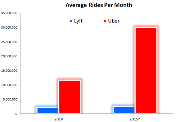 Chart by author. Data source: Uber and Lyft. Note: 2015 figures above are based on the beginning of 2015, not what the companies expect to average through the full-year 2015 -- those figures will likely be higher -- whereas 2014 figures above show the average monthly numbers.
