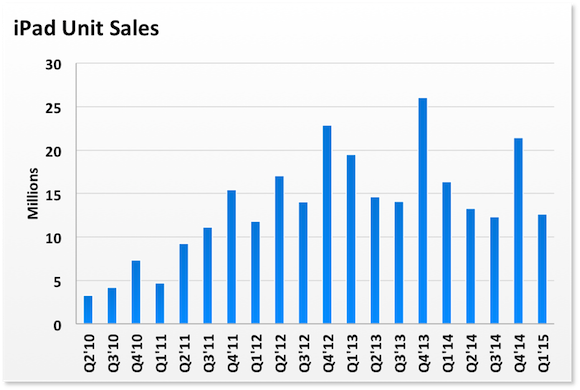 Quarterly iPad unit sales have been relatively sluggish over the past year or so, following the first few years of incredible growth. The first wave of consumer adoption has taken place, and now the market is moving on to late-adopters and upgraders.