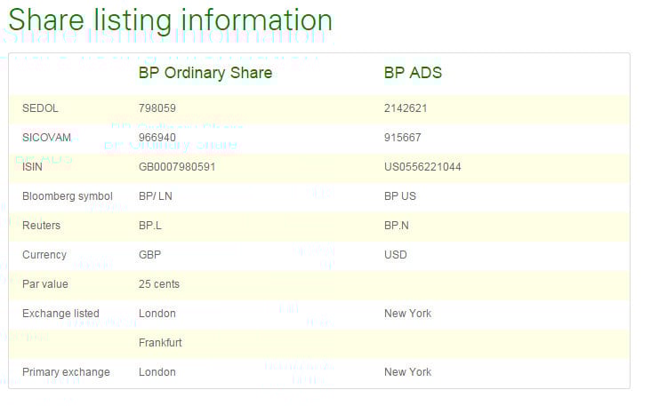 Note that the BP Ordinary Share, which is primarily traded in London, has a different SEDOL number than the company's ADS. There are two things worth noting here, first BP's SEDOLs are all numbers, which tells us they were issued prior to Jan. 26, 2004. Further, the London SEDOL number is just six digits. This is because in older SEDOLs the first number was the country code, which for Britain was zero, and therefore the zero is implied and not included in the listing above. Meanwhile, the one for the U.S. SEDOL corresponds with the earlier U.S. country code of 1.