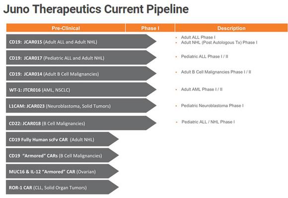 Juno's platform employs modified T cells (CARs and TCRs) to treat a range of blood-based cancers (various types of leukemia) and a handful of solid tumors. Even so, the company is still in the early stages of clinical testing, shown by this snapshot of its current pipeline: