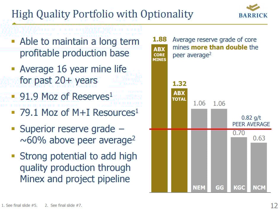 Both companies have their strengths and weaknesses. Barrick Gold's greatest strength lies in its high-grade reserve base. As the slide below shows, its core mines have nearly double the reserve grade of its competitors, including Newmont Mining.