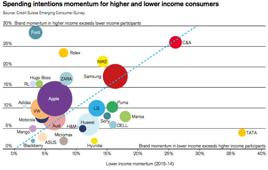 No brand analysis would be complete without mentioning Apple, and once again we see steady improvement in momentum this year among both income groups. The size of the bubble is reflective of Apple's broad penetration in the largest emerging markets, notably China.