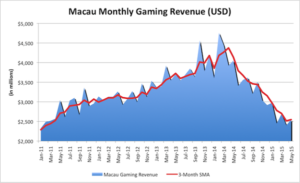 Macau has gotten a lot of bad headlines lately. Early this week the government announced gaming revenue figures for May and they declined 37% to $2.5 billion, continuing a long slide in the Chinese gaming enclave.
