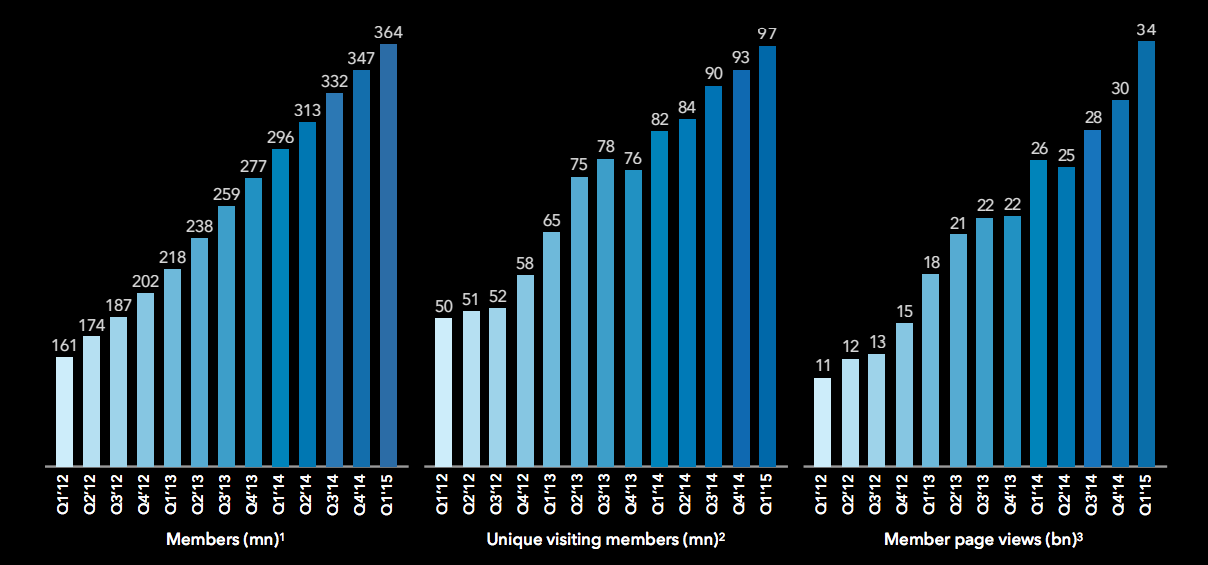 LinkedIn is well past the inflection point when it comes to scale and establishing its relevancy. The company ended the last quarter with 364 million members, a 23% annual increase. Unique visitors grew 18% to an average of 97 million per month, and member page views grew 30%, well ahead of unique member growth. The fact that page views are outgrowing members is clear sign of increasing engagement among those members.