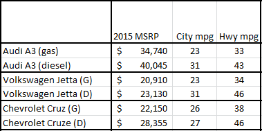 The first thing consumers need to consider is that diesel vehicles will cost consumers more upfront. The higher initial cost of a diesel vehicle is because they don't sell in volumes as high as those of their gasoline counterparts in the United States, in part because the U.S. has more strict emissions standards than, say, Europe, where diesel vehicles are more popular. Here are a few examples of the difference in diesel MSRP and their gasoline counterparts.