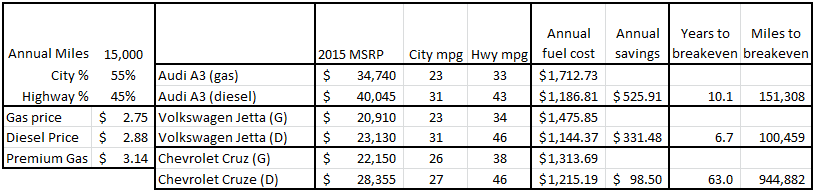 As a rule of thumb, consumers should keep in mind that breakeven points could change significantly in favor of diesels if you do more highway driving than the excel model (that is, 45% of your miles), or drive significantly more miles overall (15,000).