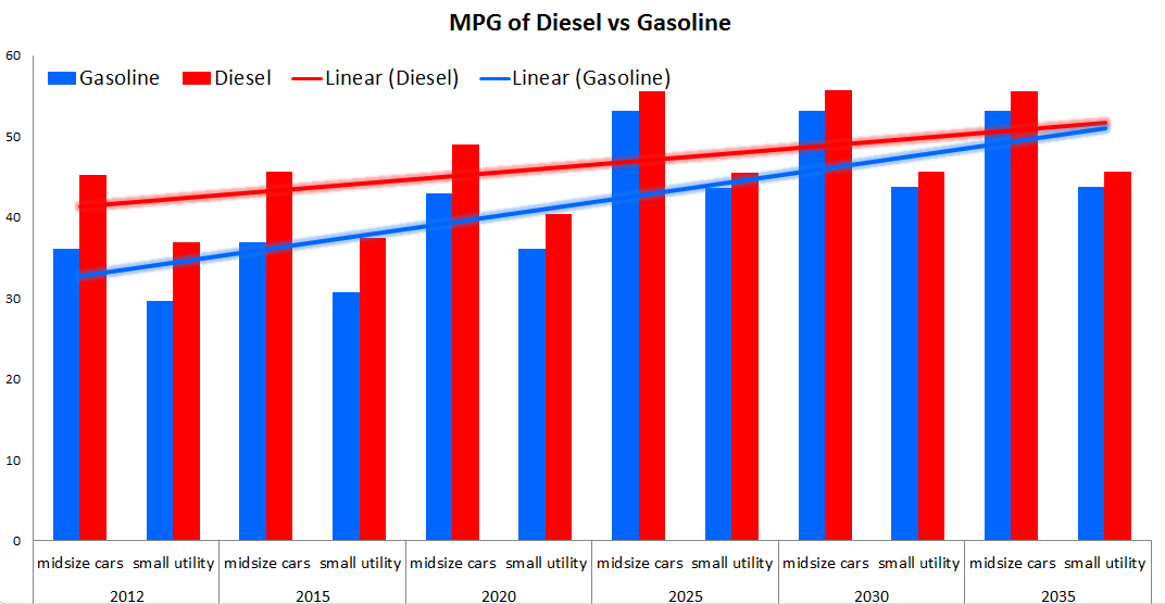For a glance into the future, Chevrolet's Cruze is a good example of what consumers looking down the road can expect from diesel and gasoline differences in the U.S. market. As you can see, the diesel version of the Cruze held a meager one mpg advantage in the city, largely due to the gasoline's 1.8-liter Ecotec engine. The Cruze even offers a 1.4-liter Ecotec turbo, which wasn't used in the diesel comparison excel model, which can get up to 28 mpg in the city and 42 on the highway. And General Motors isn't the only automaker significantly improving gas mileage: many automakers are using turbocharged engines -- such as Ford's popular EcoBoost -- and reducing overall vehicle weight. As these trends continue, look for the mpg advantage owned by diesel vehicles over their gasoline counterparts to slim down. Don't take it from me -- here's a projection from the U.S. Energy Information Administration.