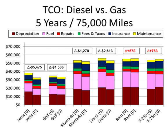 Also, as briefly mentioned earlier, diesels will hold their residual value better than gasoline counterparts. In fact, in a study by the University of Michigan, nine out of 10 diesel cars and trucks had higher five-year residual value than their gasoline counterparts -- half of those vehicles held an advantage of 10 percentage points, or 1,000 basis points.