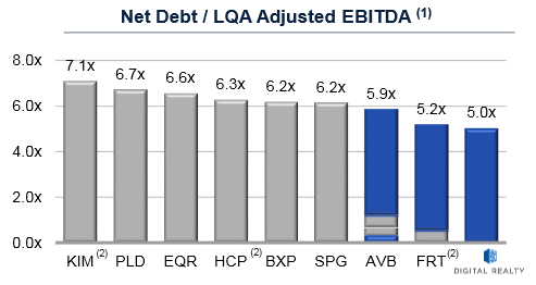 While Digital Realty has performed tremendously and looks attractive as an investment, the stock is valued well below its peers. First, on a positive note, the 5.12% dividend yield is well above the REIT sector average of 3.4%, and the company's debt levels are also below most of its peers'.