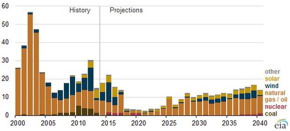 For wind and solar, a combination of government support in the wake of environmental reckonings and technology have helped these two renewable resources go mainstream. And for the next 25 years, the Energy Information Administration expects these three energy sources to collectively account for nearly all new capacity additions.