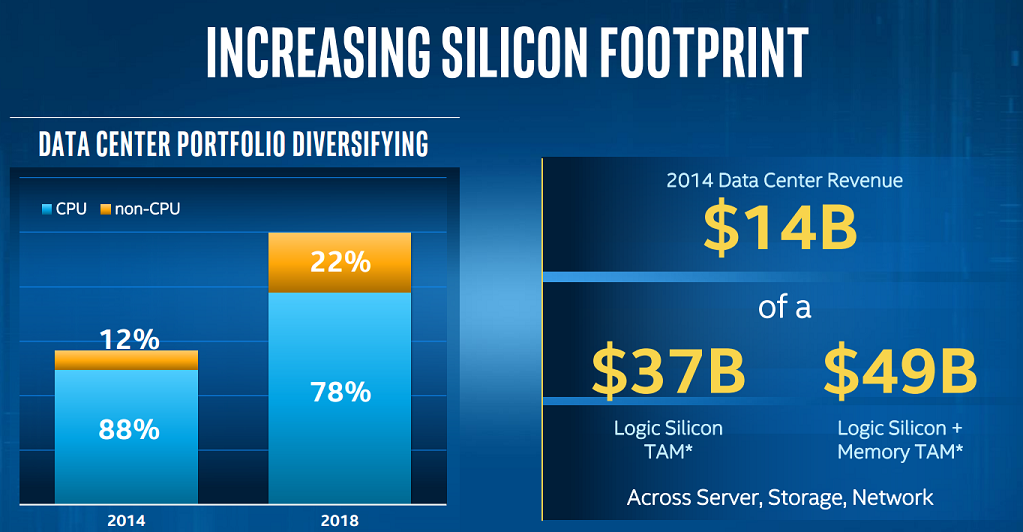 Notice that, according to a 2014 report from Bain Research, the total addressable market in server, storage, and networking logic silicon is approximately $37 billion. Using Intel's 2014 data center revenue of $14 billion, this implies that Intel captured "only" 37.8% of the total data center logic silicon total addressable market during 2014.