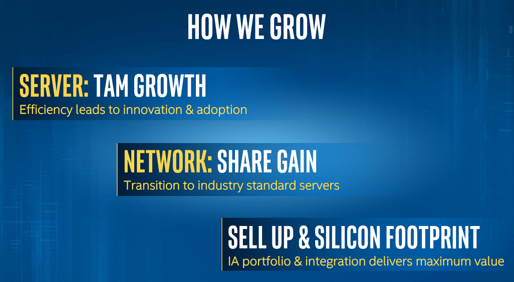 The strategy, in "big picture" terms, is pretty clear: Intel wants to grow its total addressable market in servers (since its market share is so high), grow its market segment share in networking (where its share is fairly low), sell a richer product mix, and grab more silicon content within the data center.