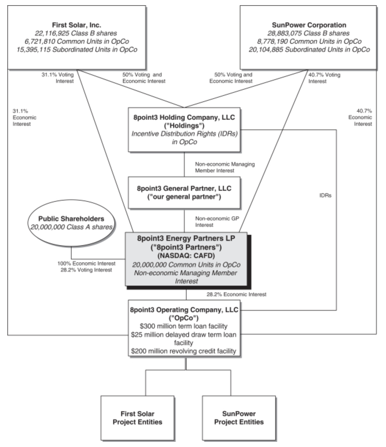 With that money and $525 million in additional borrowing, the yieldco will pay $359.9 million to SunPower and $275.6 million to First Solar for the projects they're including at IPO. SunPower will also own 28.9 million shares (a 40.7% interest in 8point3 Energy Partners) and First Solar will get 22.1 million shares (a 31.1% interest).