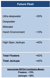 Meanwhile Atwood Oceanics, while possessing a much smaller fleet -- just 13 rigs, including two UDW newbuilds -- represents a more concentrated bet on the future of deep sea drilling. That's because 62% of Atwood's fleet is composed of UDW rigs which command day rates many times larger than other rig types, such as shallow water jack-ups -- which can only operate in a few hundred feet of water.