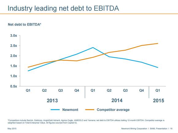 While Newmont Mining's mines aren't quite as high grade as Barrick Gold's, its mines are still well above the peer average and second best overall. Further, the company is also a fairly low cost producer as it expects its AISC to average between $960-$1,020 per ounce in 2015, with its AISC potentially falling to an average of $925 to $1,025 by 2017. Further, the company recently acquired another low-cost miner that expects its AISC to average between $825 to $875 per ounce over the next two years. Because that's lower than Newmont Mining's average cost, the acquisition has the potential to push Newmont's AISC even lower. In addition to that, the company sees the potential to get those costs at least 10% lower through optimization.