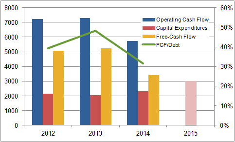 With this in mind, I've decided to make things clearer by calculating free cash flow (operating cash flow minus capital expenditures) compared to year-end debt levels for the last few years. As you can see in the chart, the ratio (green line) declined in 2014 and is likely to come under pressure should UPS increase its capital expenditures to $3 billion as outlined in its 10K filing. Similarly, operating cash flow took a hit in 2014 as profits were hit by poor execution during the Christmas period.